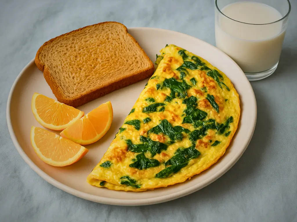 A great morning sets the tone for the entire day, and few meals do that as effortlessly as this Ultimate Complete Breakfast. A simple, yet nutritionally robust plate featuring a fluffy spinach omelette, whole-wheat toast, fresh orange, and a glass of fortified milk. Itβs fast, clean, balanced, and deeply supportive of metabolic health, digestion, immunity, and brain function.